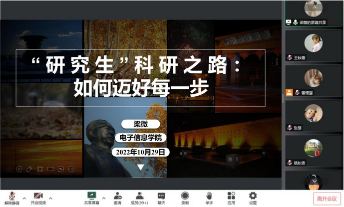 梁微以《研究生科研之路:如何迈好每一步》为题,结合自身丰富的科研经历,从研究方向的选题,科研实践的安排、学术论文的撰写以及全面发展等方面,为大家带来了精彩的报告。随后,梁微同与会师生进行了充分交流,对大家提出的如何高效阅读文献,如何撰写高质量学术论文,以及如何排解科研中的压力等问题进行了详细的解答。本次学术沙龙为同学们走好科研之路提供了良好的指引和帮助,同学们纷纷表示收获颇丰。