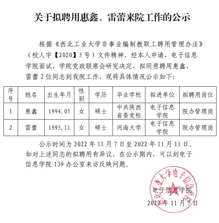 关于拟聘用惠鑫、雷蕾来院工作的公示
