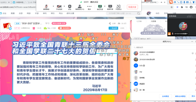 团委学生会、各团支部积极响应团中央号召,组织全体成员在各大平台观看了在线直播,通过“学习强国”学习平台、央视新闻客户端及共青团中央微信、微博、B站、快手、抖音、微视、斗鱼、虎牙、今日头条等官方账号及平台观看,共享这场青春的盛会。