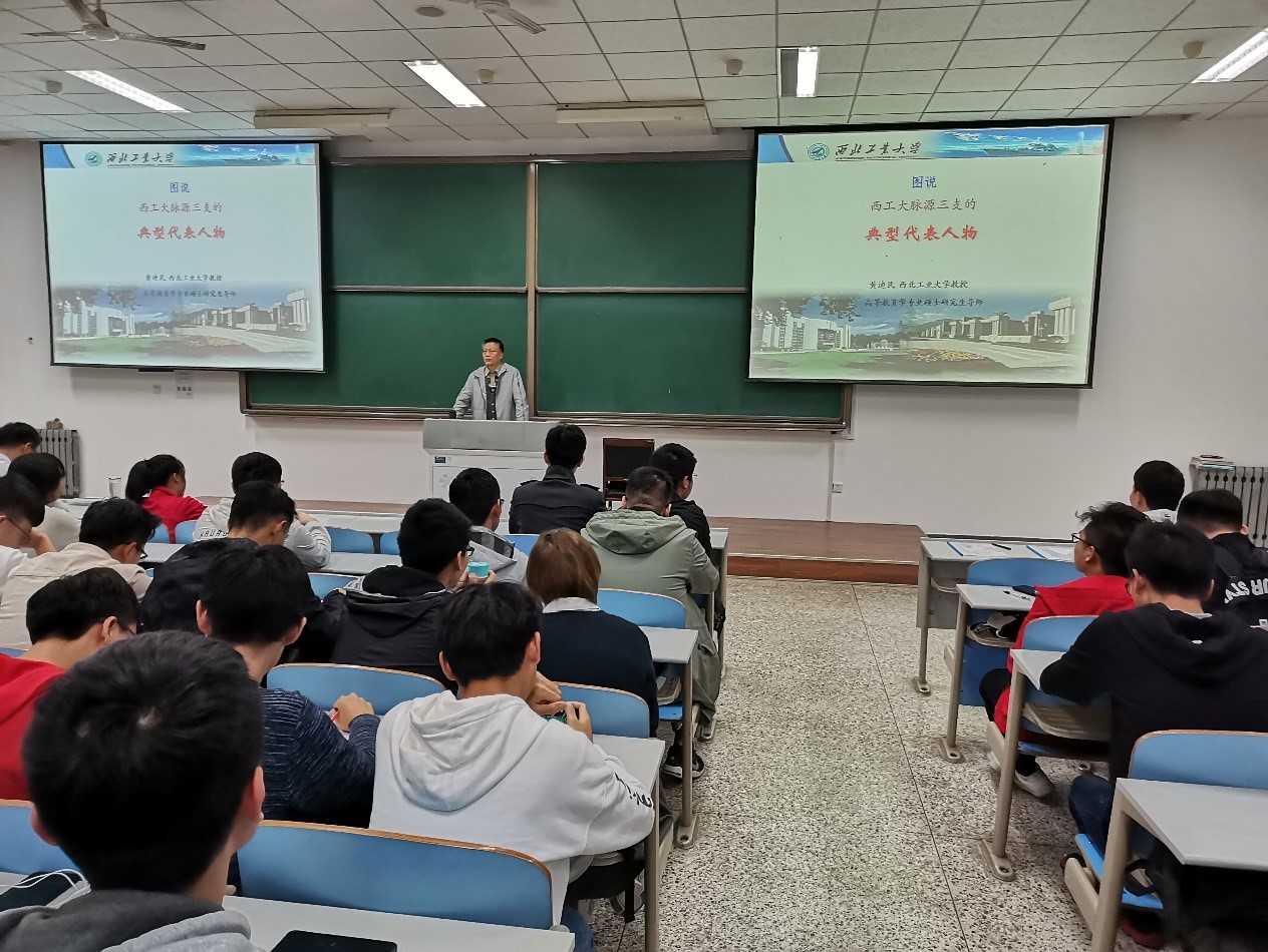 首先,黄教授与在场的同学开展互动,掌握了同学们对“西工大脉源三支”相关知识的了解程度与认识深度,因材施教地向大家讲述西工大令人敬重钦佩的三支脉源及三位杰出代表人物。红军干部刘海滨书记一生艰苦奋斗、勤俭朴素、严于律己,为党和人民无私奉献,他的事迹让我们十分动容;西工大首任校长寿松涛先生戎马半生、呕心沥血、一片热忱,他三建学府,培育英才,创造了新中国高等教育历史上最伟大的“西迁”,谱写了西工大世纪壮歌,更谱写了新中国航空教育壮歌;唐铎少将是哈军工空军工程系创始人,他同时也是伟大的革命家、教育家,他一生都在为共产主义奋斗,他是个杰出的国际主义战士。