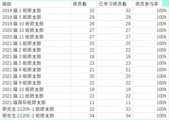 然而,少数班级完成率仍低于50%,极个别班级完成率低于20%,如研究生19208-6团支部、研究生19208-3团支部、2018级08061803班团支部、2018级08061804班团支部、2018级08061805班团支部、2018级08061809班团支部,希望这些班级在之后的学习中能够提高学习积极性,向完成率较高的团支部汲取经验,按时完成学习任务。
