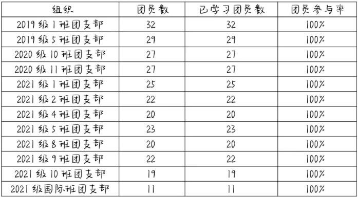 总体完成情况较好,参与人数继续保持全校第一!有12个团支部完成率达到100%,在此对这些团支部提出表扬!希望所有团支部在青年大学习过程中向它们看齐,不断进步,越来越好!