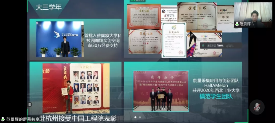 2018级本科生范景辉同学以《知行合一,止于至善》为主题,分享了自己大学三年来在竞赛科研以及联合国进修实习过程中的经历与收获,讨论本科生如何丰富充实大学生活,如何克服焦虑、迷茫,开拓格局,在复杂多变的大变革时代中如何明确自己的目标并为之持续奋斗,成为适应变化、引领变化的人才。范景辉同学的分享富于哲理和深思,对于同学们的学习生活以及人生规划都有很大的参考价值,大家受益匪浅。