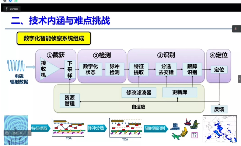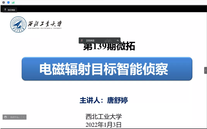 2020级研究生唐舒婷。活动伊始,主讲人向大家介绍了利用电磁辐射特征刻画目标特性的研究现状,阐述了传统电子侦察面临的挑战,并指出如何利用智能化手段实现自适应、可解释、灵活地处理目标电磁信号已成为电磁辐射目标智能侦察的关键核心。随后,围绕电磁辐射目标智能侦察中的处理流程,主讲人向大家介绍了高效率信号分选和高准确率电磁辨识两个核心技术。最后,随着主讲人分享自己研究生期间的科研心得与体会,本次微拓活动圆满结束。