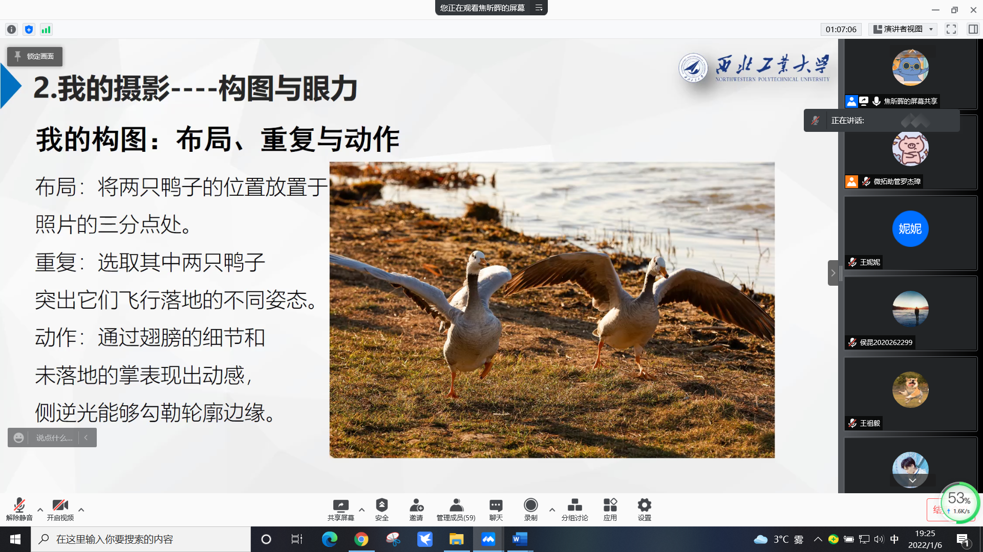 2020级博士生焦昕晖。在本期微拓活动中,焦昕晖分享了自己在科研和生活的经历与收获,还结合自己对摄影的理解,通过实际例子介绍了如何拍摄一张具有美感的照片、如何利用镜头捕捉校园内外的精彩瞬间,并讨论了图画与摄影艺术之间的相互关系。焦昕晖的分享激发了大家对摄影的兴趣,同学们纷纷表示受益匪浅。