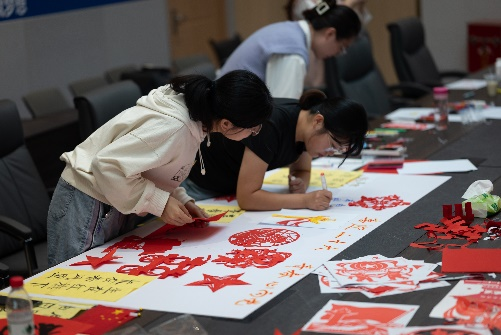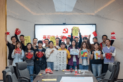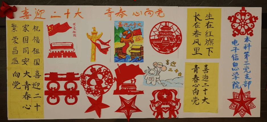 重温入党誓词后,支部开展以“喜迎二十大,奋进新征程”为主题的美育实践活动。本次实践共有绘画、剪纸、书法三种形式。各位同志以绘画绘就了自己心中新时代中国梦的美好蓝图;以一张张红色剪纸展现出新征程下人民的美好愿望;以手中之笔,写下了对祖国的祝福与热爱、对祖国未来发展的愿景与期望!在这场美育与劳动的有机结合中,支部中的各位同志也在党的二十大即将召开之际,为自己未来的所作所为提出更高的标准与要求:成长成材的答卷要更为亮丽,担当实干的姿态要更加昂扬。要始终保持“中游击水,一往无前”的精神状态与“求真务实,开拓创新”的奋斗姿态,以责任担当带动积极作为,为实现中华民族伟大复兴中国梦的磅礴进程贡献青春力量!