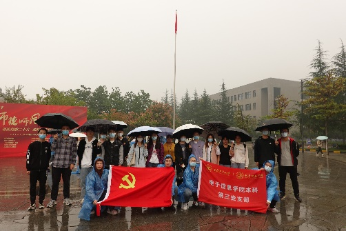 早晨七点,金秋十月的天空还下着灰蒙蒙的小雨,本科第三党支部的同志们早已集合在翱翔学生中心的升旗台下,准备观看升旗典礼。七点三十分,由sm调教