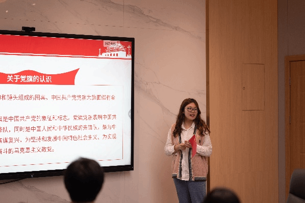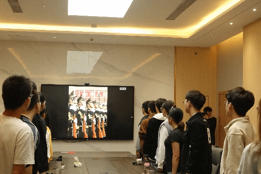 楼119会议室集合。支部副书记雷祥飞同志带领全体支部党员以视频形式重温升旗仪式。重温升旗仪式后,支部党员陈学润、王一涵同志,为大家带来了以“青春心向党,喜迎二十大”为主题的一次党课。