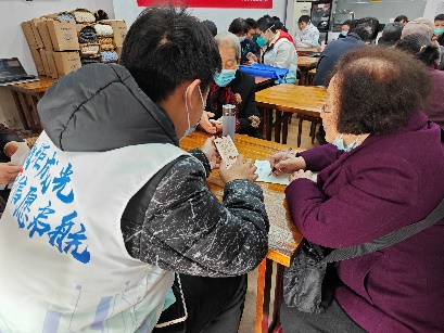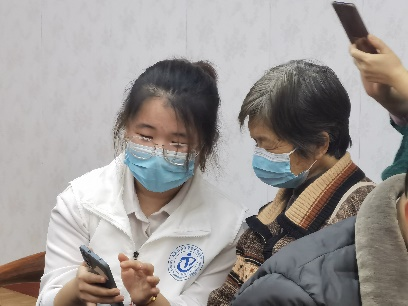 首先,王嘉悦向社区老人介绍了这次志愿服务的目的,表达了青年志愿者对社区老人的关怀。然后志愿者们协助社区工作人员给到场老人测量了血压,保障老人的身体健康。并陪同老人聊天,帮助他们解决一些基本问题。