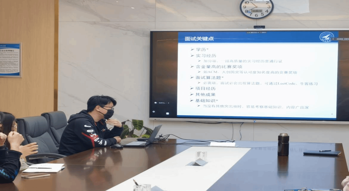 2021级硕士研究生在学院楼159会议室召开就业经验交流会,邀请本院研究生毕业年级就业助管和优秀毕业生介绍就业情况,分享求职成功经验和心得体会。会议由辅导员范西昆主持,采用线下线上同步的方式进行,100多名21级研究生参会。
