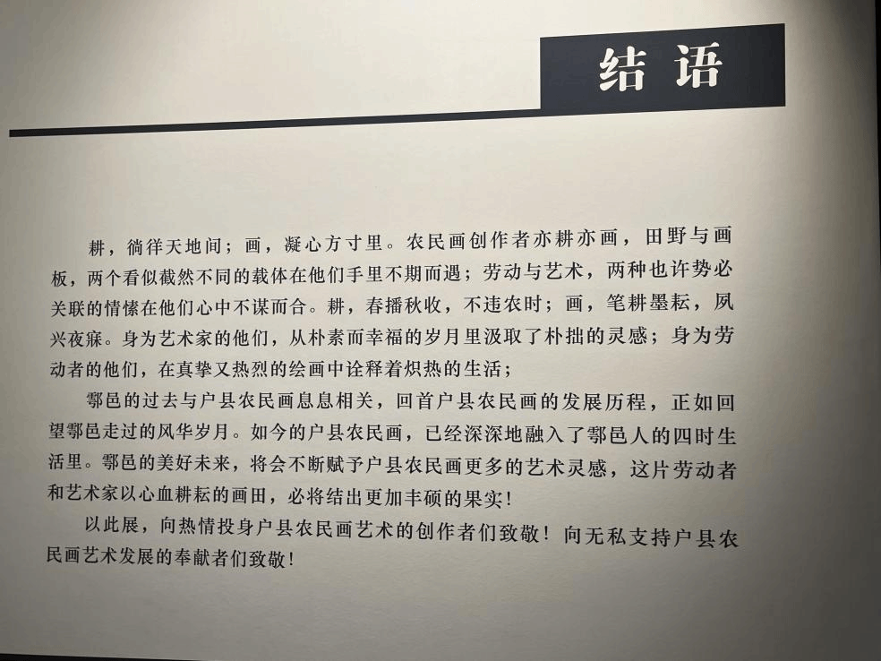绚烂的色彩不灭,美丽的精神不老。正如雒志俭所说:“农民画是紧跟时代发展的,最能反映时代精神”。像这样的艺术也许有人会因为接地气而忽视它,但它们的艺术内涵十分丰富,艺术灵感也能为许多其他画派提供思路,是母系艺术里当之无愧的中流砥柱。传承和发展农民画,是新时代青年当之无愧的责任。了解户县画乡,走近农民画的历史长廊,同学们能学习到的不仅仅是美,更是中华民族生生不息的命脉,值得永续的精神。