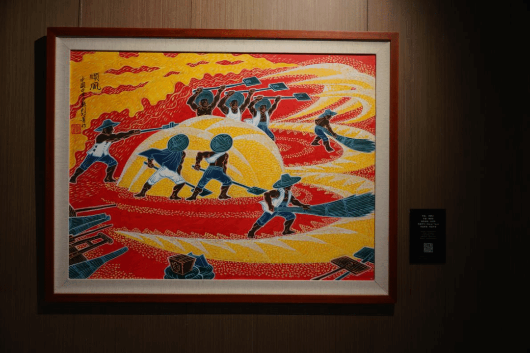 在画展一楼的核心区域,一张张农民画出现在同学们眼前。在明媚的秋日,能比湛蓝的天空和金黄的银杏叶更璀璨的,是农民画浓重的色彩,饱满的布局,以及那细腻而又不失张力的线条。通过讲解同学们得知,农民画地域特色鲜明,画面简洁而饱满,想象大胆丰富,风格浪漫稚拙,是中国绘画史上不可多得的素材源泉。