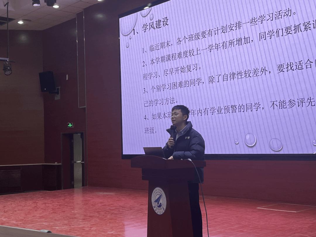 首先,辅导员翟伟乐就本学期学风建设中好的方面和存在的问题做了分析,分享了本年级班风、学风建设的优秀案例,强调了做好期末课程备考的重要性。勉励全体同学要及早准备、合理安排、做好个人时间管理、高效开展课程复习,同时各个班级要积极营造良好的学习氛围、加强同学们的沟通交流,力争使全体同学都能够取得理想的成绩。