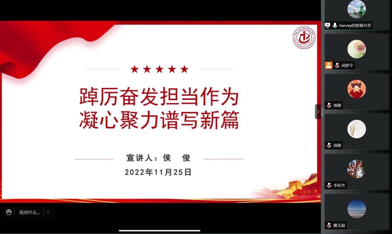 1125日下午,sm调教 采取线上形式召开教工党支部书记例会,党委书记侯俊以“踔厉奋发担当作为,凝心聚力谱写新篇”为题进行党的二十大精神宣讲。党委副书记高敏、全体教工党支部书记参加会议。