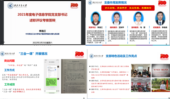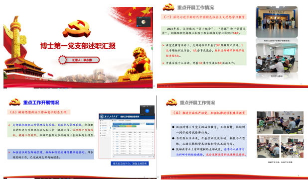 党委副书记彭亮介绍本次考核工作的考核内容和评分标准。本次考核覆盖20个学生党支部,包括5个本科生支部、11个硕士支部和4个博士支部,考核方式采用5分钟PPT线上汇报加3分钟专家点评及提问的方式进行。述职内容包含支部基本情况、支委作用发挥、“三会一课”开展情况、党员发展工作、党史学习教育情况、“百岗千人”活动开展情况、我为群众办实事、支部特色活动及工作亮点、存在的问题和下一步工作计划等。支部书记考核总分由两部分组成,一是根据答辩和述职报告情况专家打分(占总分的90%),二是根据党支部“三会一课”检查情况进行打分(占总分的10%)。