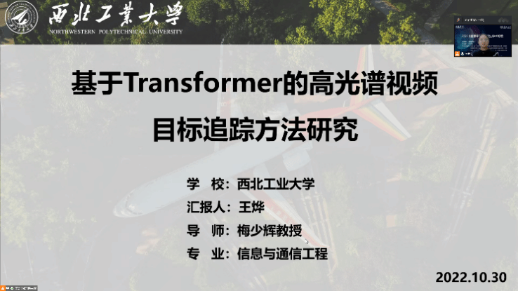 智能光电信息获取与处理课题组梅少辉教授指导的博士生王烨获得此论坛的优秀报告。王烨同学在此论坛分享了《基于Transformer的高光谱视频目标追踪方法研究》的相关工作。