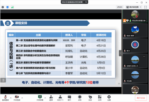 、自动化学院、计算机学院、光电与智能研究院等4个单位12位老师共同打造,讲授通信信号处理、信息融合、搜索与挖掘、图像视频分析与理解等关键技术,包括信息与控制、图形图像处理等内容。希望通过本次授课,能够帮助学生了解信息领域的新技术,掌握复杂问题的解决思路和方法,提升学生的科学素养和科研能力。