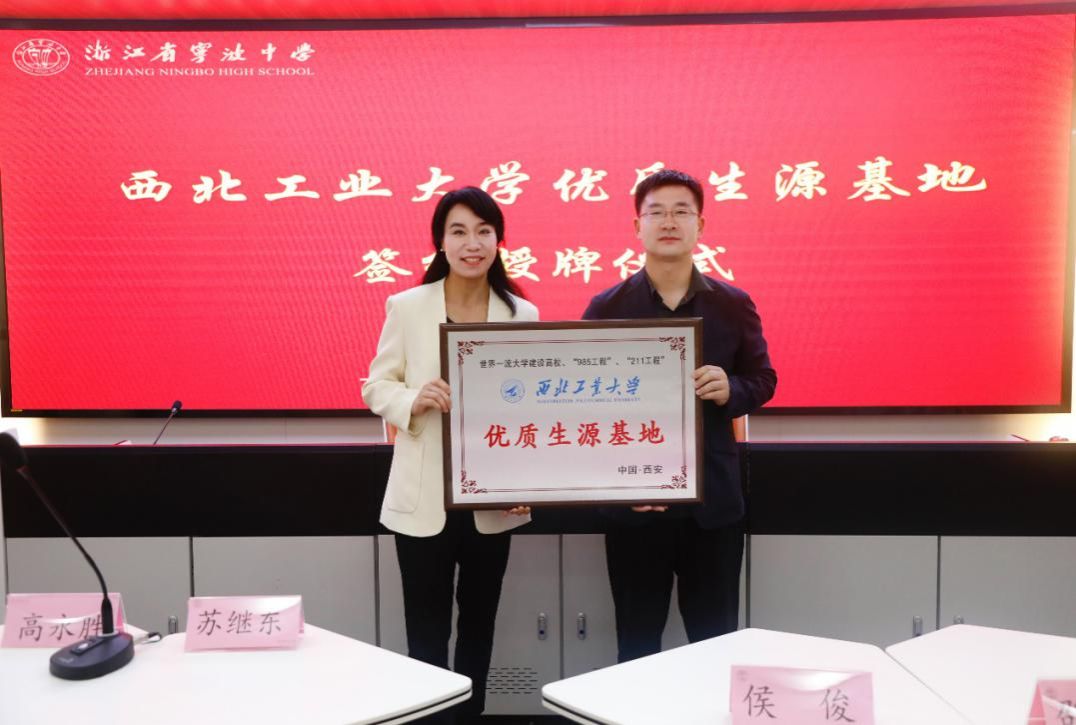 -宁波中学优质生源基地”授牌仪式在宁波中学报告厅隆重举行,宁波中学邵迎春校长和相关老师出席了授牌仪式。侯俊和邵迎春分别介绍了各自学校情况,随后,侯俊代表学校与宁波中学签订优质生源基地挂牌协议,为宁波中学授牌,并赠送歼-20飞机模型、仿蝠鲼柔体潜水器模型等礼物。