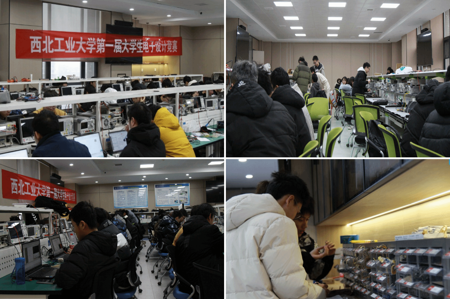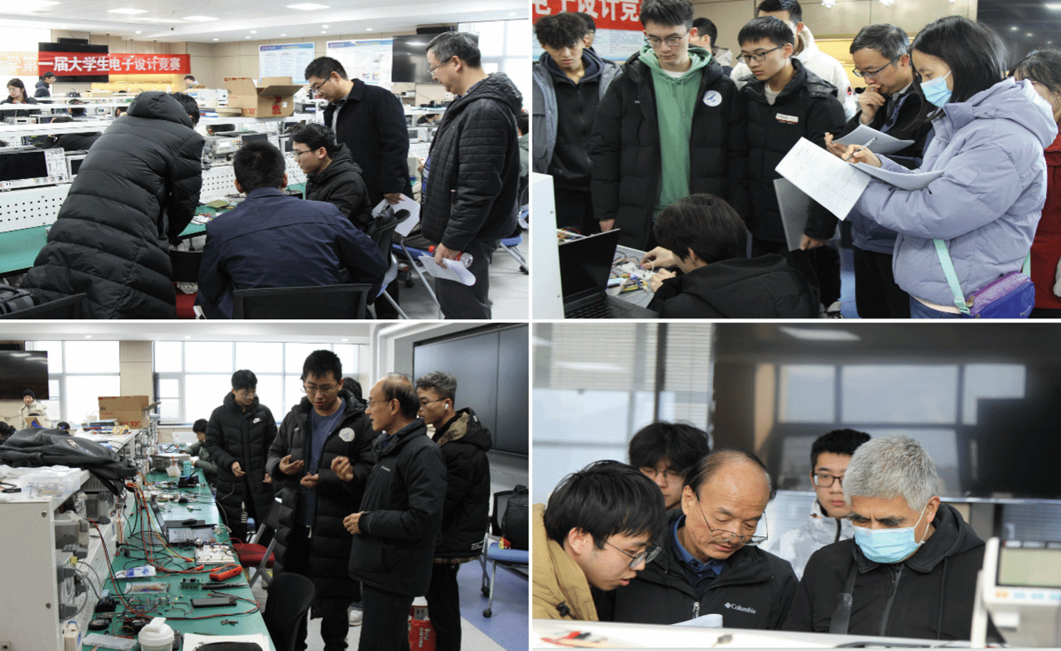 四天三夜的比赛于1月21日落下帷幕。1月22日上午,西安电子科技大学任爱锋教授和陈彦辉教授、特邀西安交通大学陈伟副教授和张翠翠副教授、我校于海勋教授和李会方教授六位老师担任评审专家,在信息类综合创新实验平台进行集中评测。经过一上午的激烈角逐,本次竞赛共产生奖项五十项。