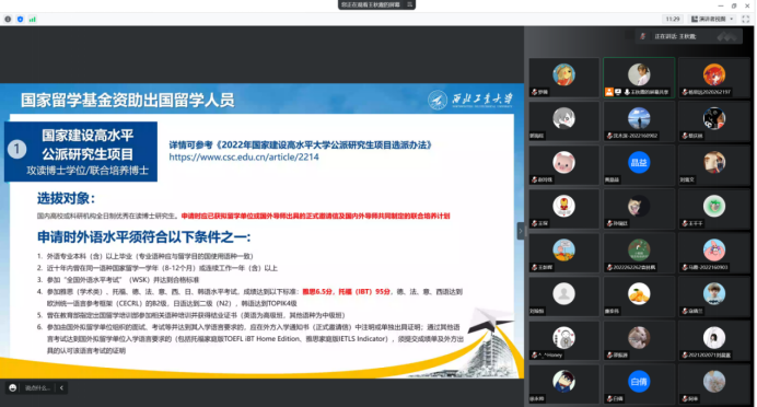 为帮助学生进一步了解赴国(境)外交流的相关政策,提升学生国际视野,2022年9月20日晚上8点,sm调教 召开研究生赴国(境)外交流项目线上宣讲会,学院国际化秘书王秋霞老师详细介绍了研究生赴国(境)外交流的相关项目政策及流程办理,学院硕博各年级近百名学生线上参会。