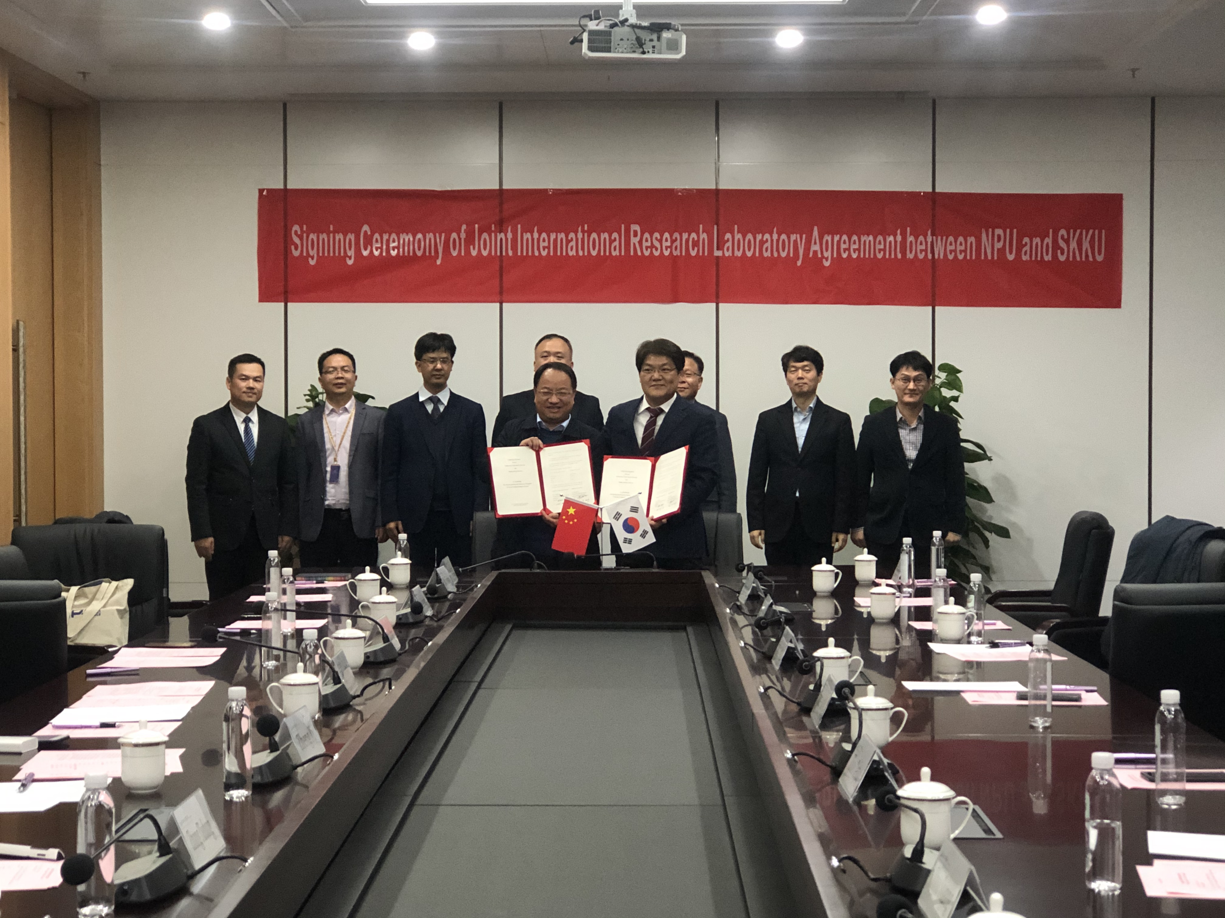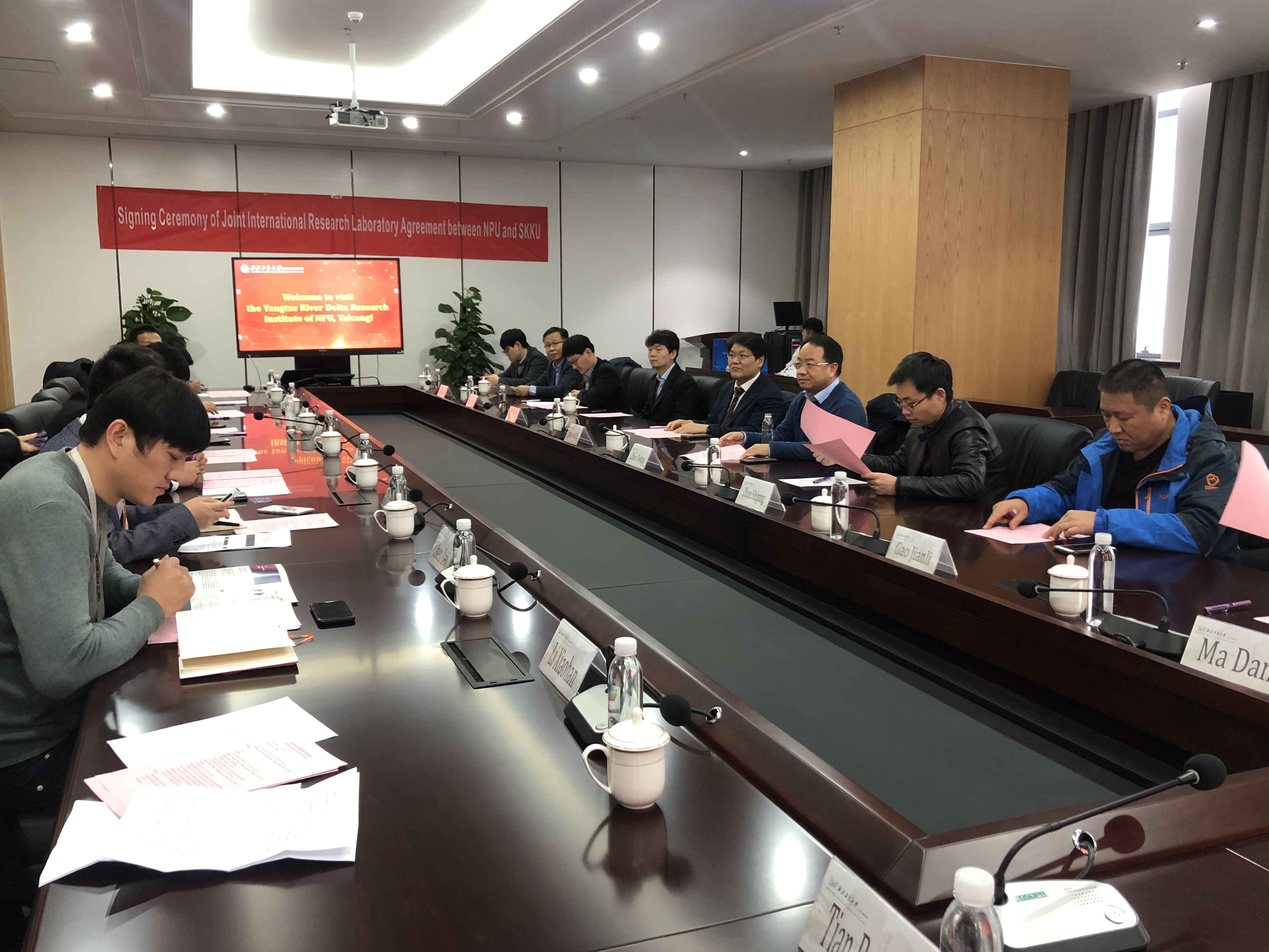 随后,访问团就太仓校区、长三角研究院建设发展情况,建立西工大-成均馆大学联合研究实验室进行座谈交流。郑曦常务副院长代表长三角研究院与太仓校区管理委员会热烈欢迎访问团一行的来访长三角研究院张铁邦副院长介绍了长三角研究院情况;周德云院长简要介绍了我校和成均馆大学关于合作办学的进展筹备情况,并介绍了国际联合研究实验室的科研方向和目标利处长表示大力支持我校和成均馆大学合作办学,并提出了明确要求;郑曦常务副院长作了总结发言,代表太仓校区管委会和长三角研究院表示大力支持与成均馆大学建立国际联合实验室落户太仓。座谈结束后,June-Ho Yi院长和周德云院长签署了国际联合研究实验室合作协议利处长和郑曦常务副院长共同为长三角研究院国际合作部揭牌。